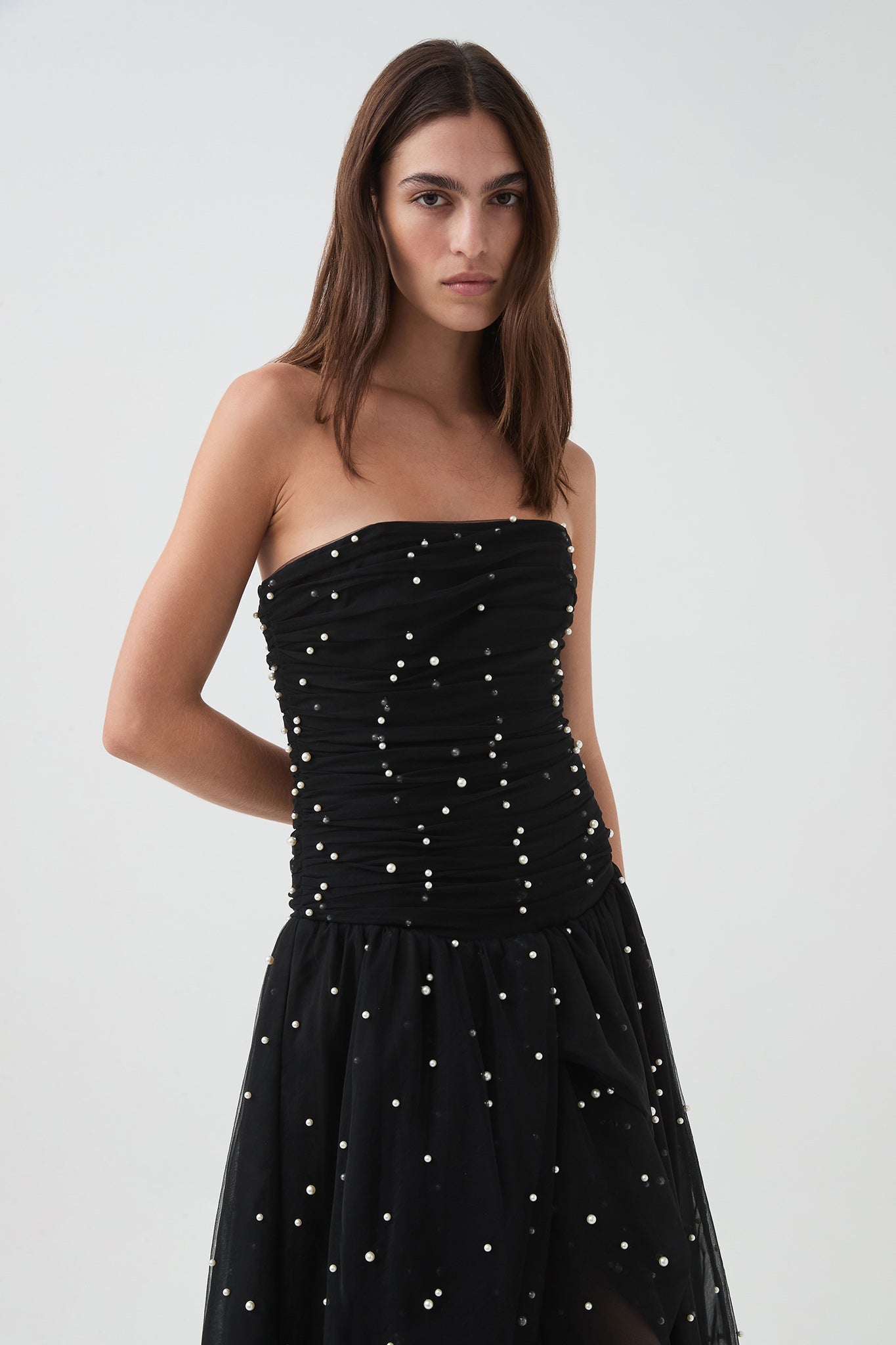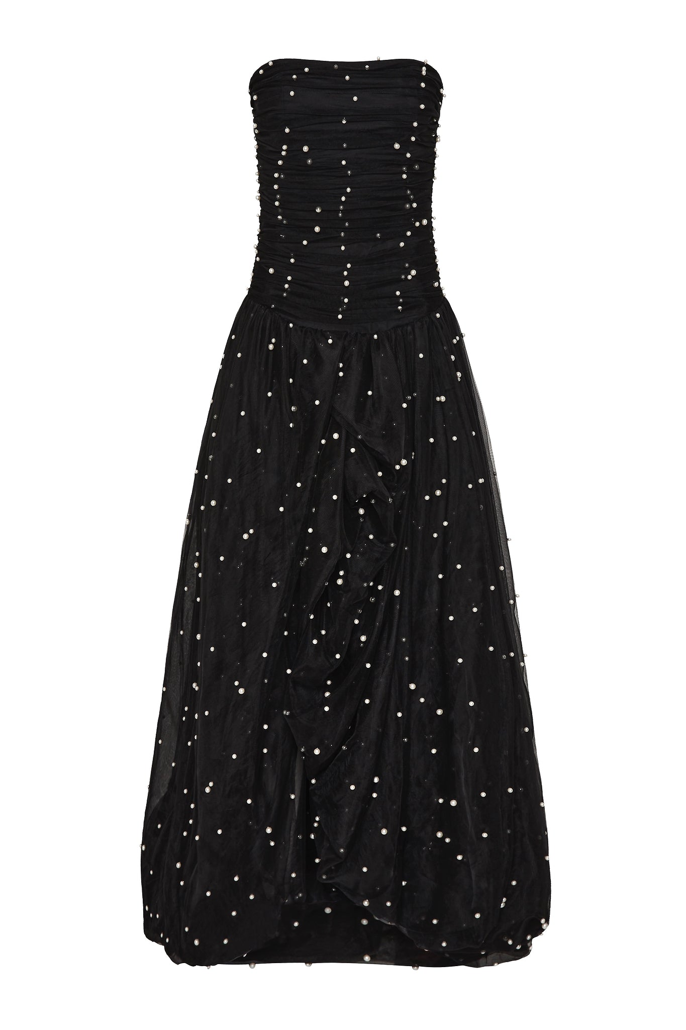 - Ruched pearl bead tulle overlay throughout bodice